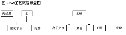 聚丙烯酰胺PAM:由丙烯腈與水在骨架銅催化劑作用下直接反應(yīng)生成聚丙烯酰胺再經(jīng)離子交換聚合干燥,等工序即得成品,工藝簡介如下: